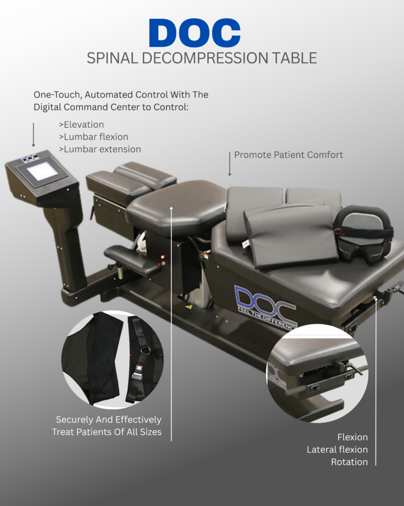 The DOC Decompression Table is a state-of-the-art medical device used to treat chronic back pain, herniated discs, sciatica, and spinal compression issues. It works by gently stretching the spine in a controlled and targeted way, reducing pressure on spinal discs and nerves. This helps improve blood flow, promote natural healing, and restore proper spinal alignment without surgery.